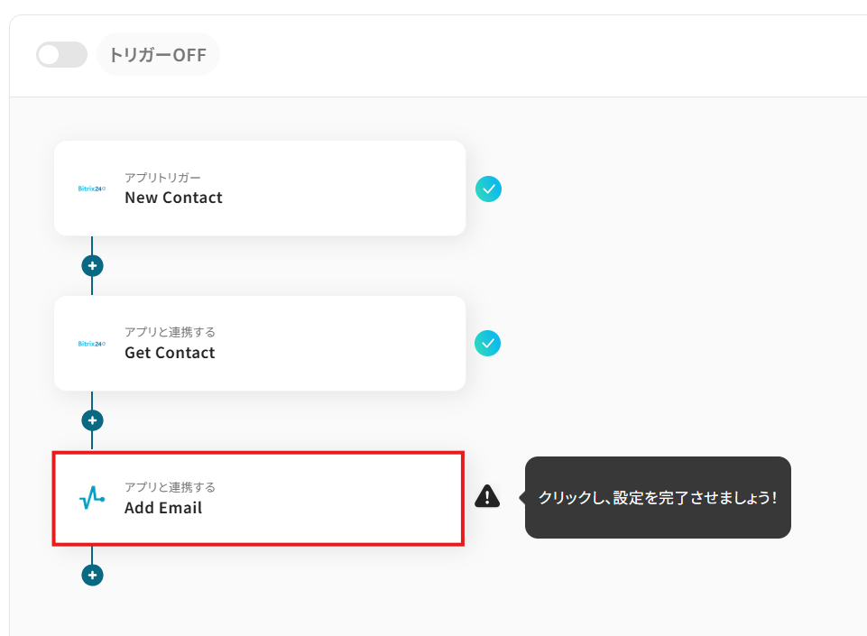 今回は「Bitrix24でContactが作成されたら、SendPulseでEmailを追加する」 フローを作成していきます! 作成の流れは大きく分けて以下の通りです。