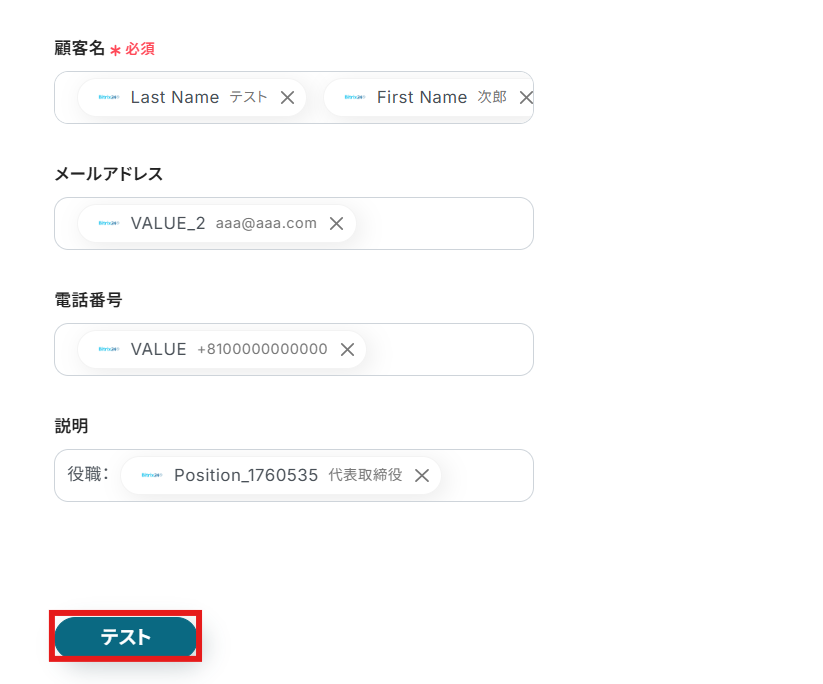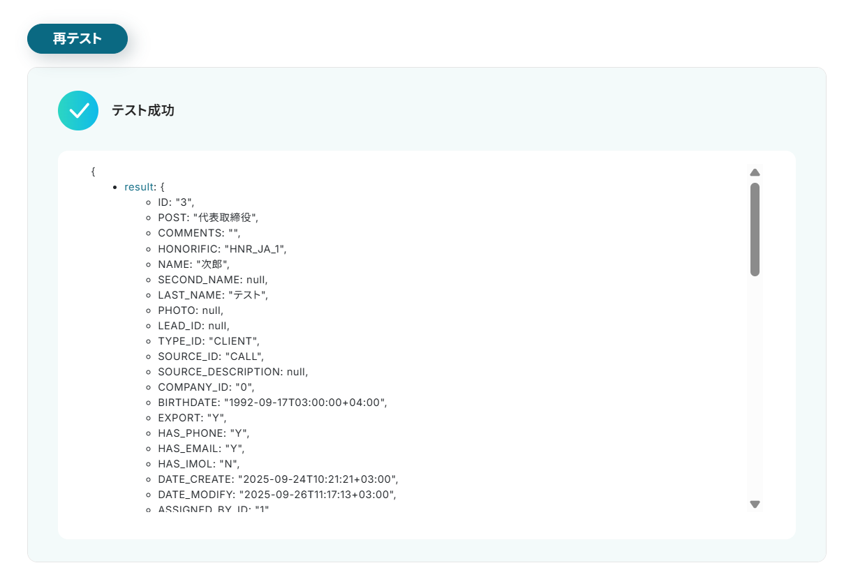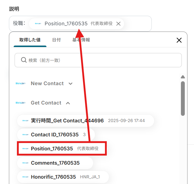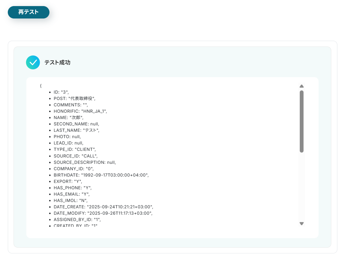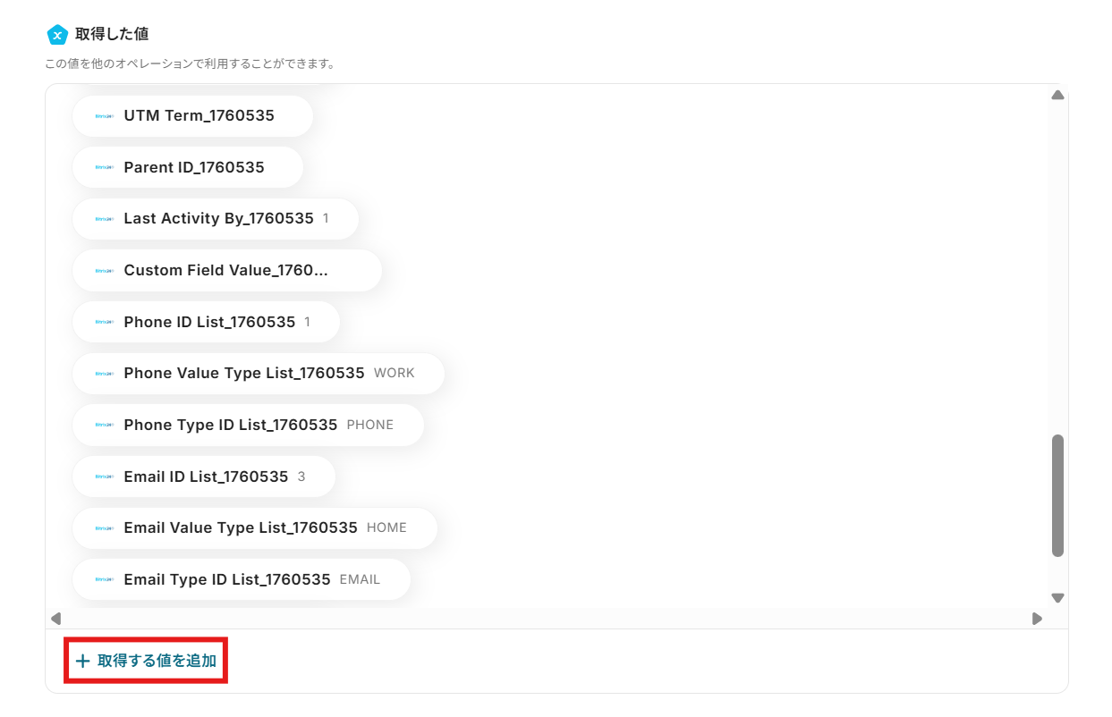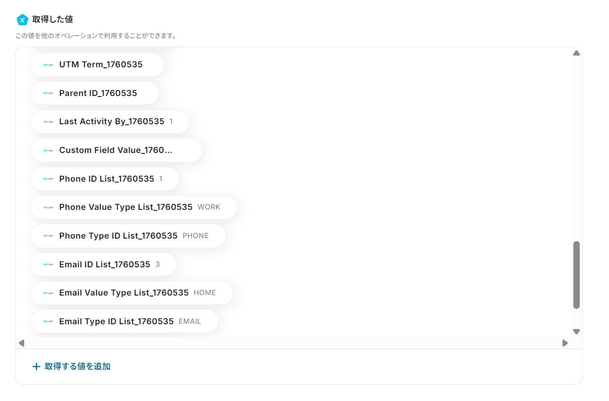 今回のフローで紹介した取得する値を追加する方法を使用して、カスタムフィールドの値も取得することで、Bitrix24で追加したカスタムフィールドについても問題なく連携が可能になります。