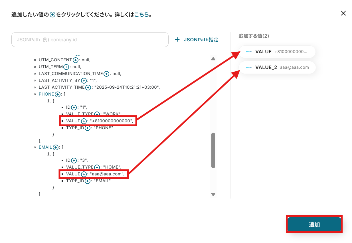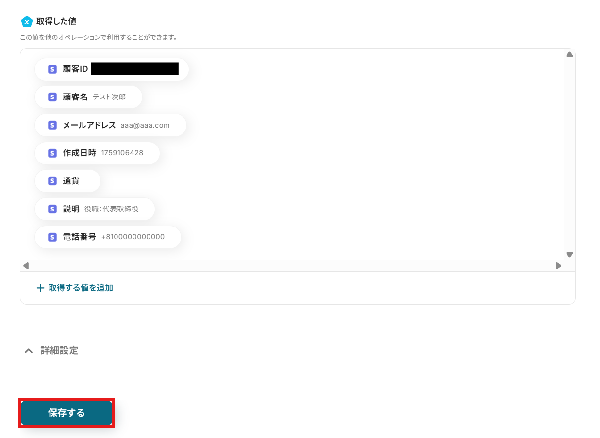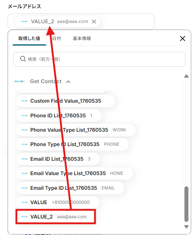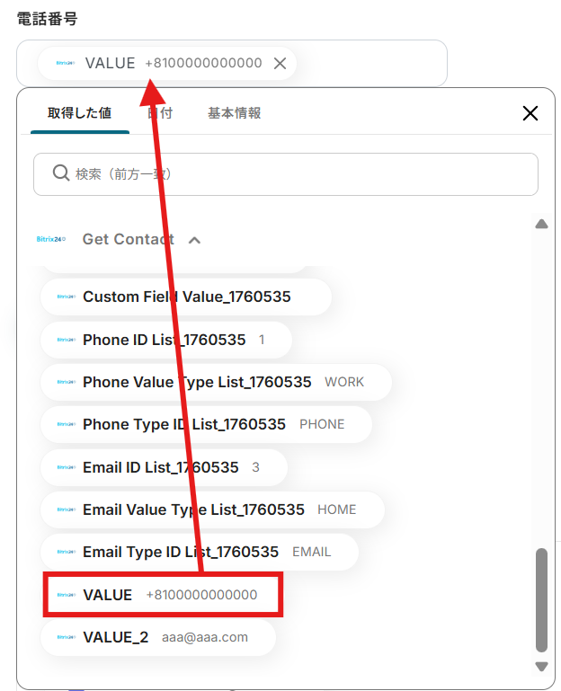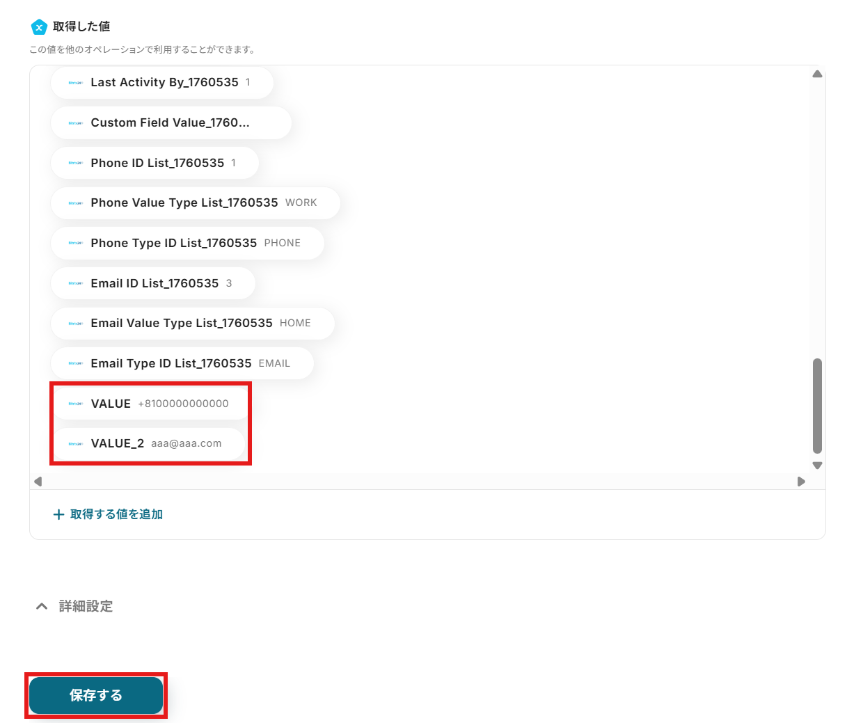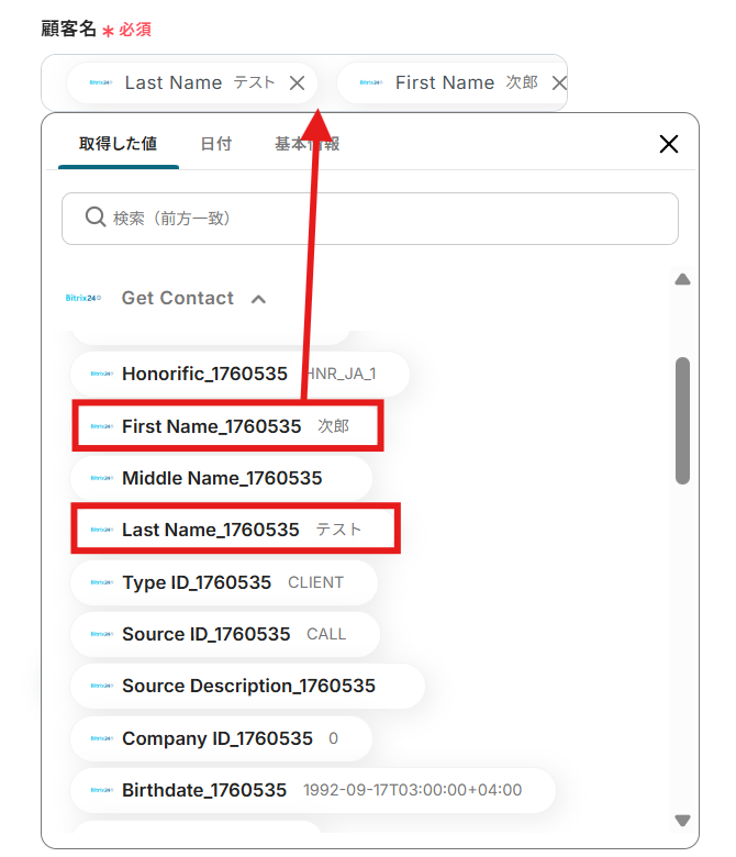 今回のフローで紹介した取得する値を追加する方法を使用して、カスタムフィールドの値も取得することで、Bitrix24で追加したカスタムフィールドについても問題なく連携が可能になります。