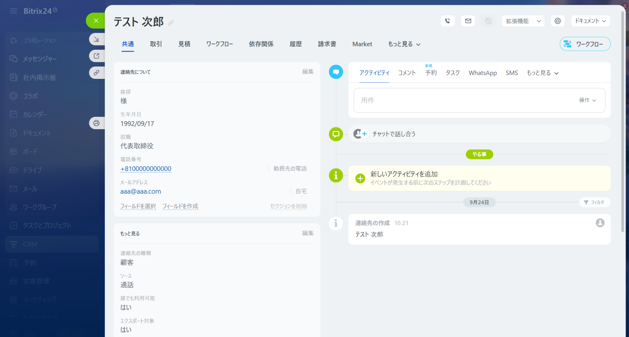 次の設定を行う前にBitrix24にて、Contactを作成しておきましょう。