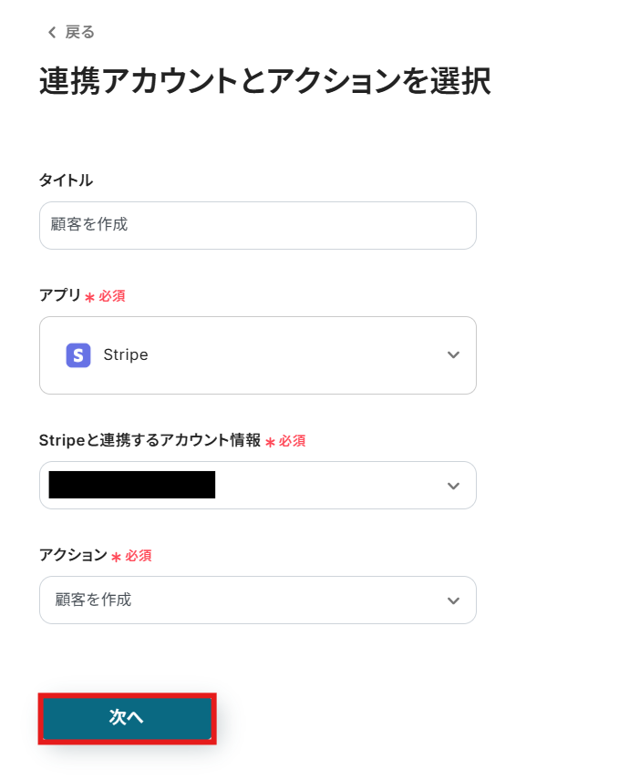 「連携アカウントとアクションを選択」画面では以下を設定します。