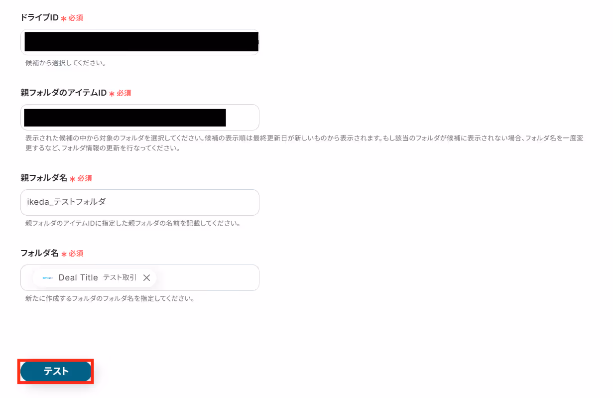 設定が完了したらテストボタンをクリックしましょう。(※実際にOneDriveにフォルダが作成されます。)