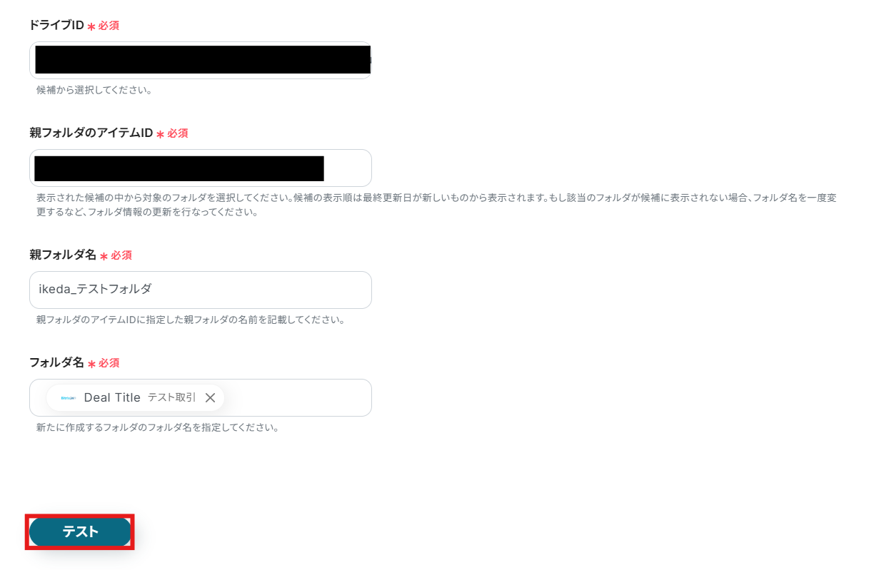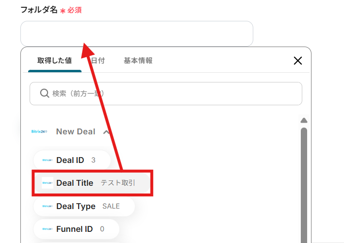- フォルダ名:プルダウンより1つ前のステップで取得したDeal Titleを選択しましょう。