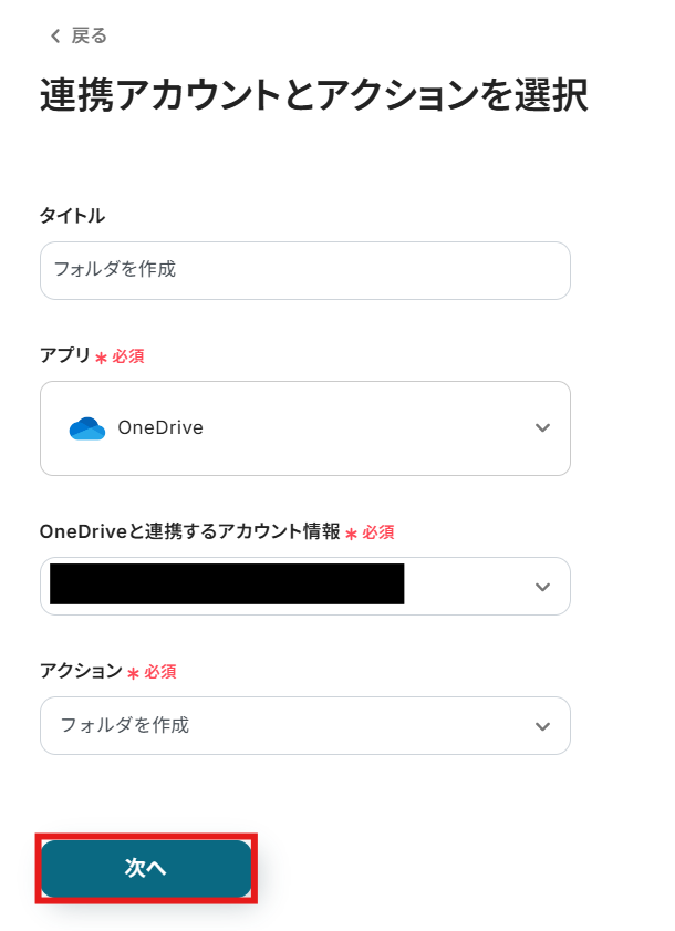 - アクション:プルダウンより設定可能です。今回はデフォルトで設定されている項目(フォルダを作成)のまま進みましょう。