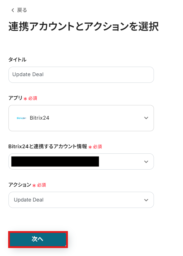 - Bitrix24と連携するアカウント情報:フローと紐づけるアカウントを選択してください。