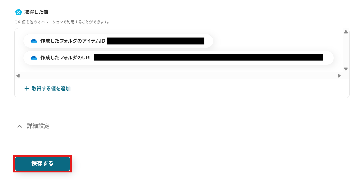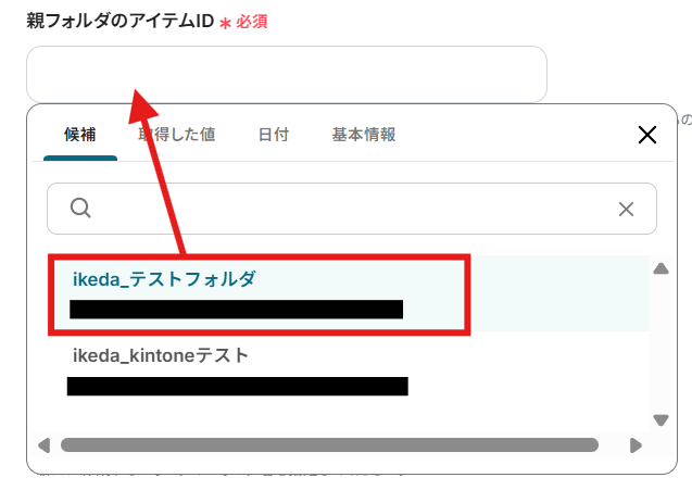 - 親フォルダのアイテムID:プルダウンよりフォルダの作成先である親フォルダを選択してください。