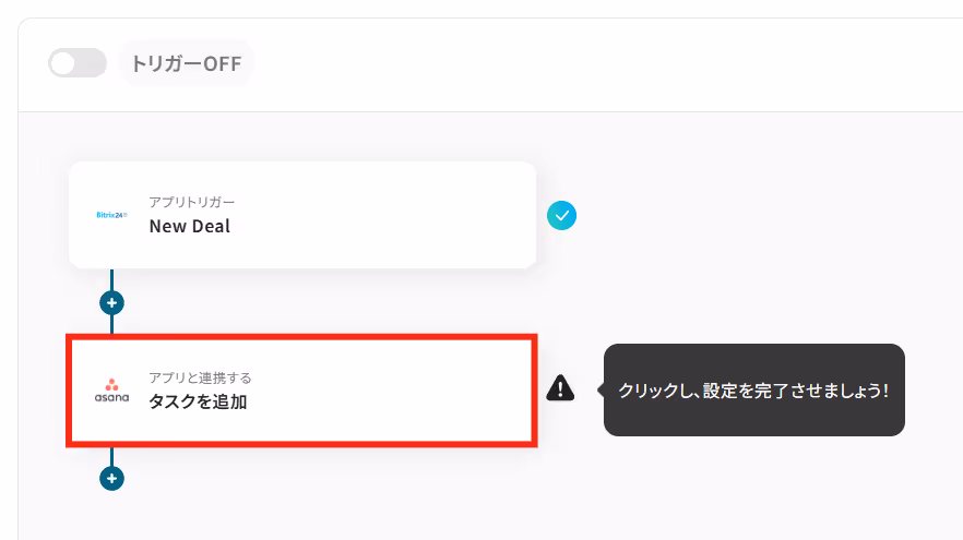例えば、「Bitrix24で新しい案件が発生したタイミングで、自動的にAsanaに担当者へのフォローアップタスクを作成する」といったことが可能になります。