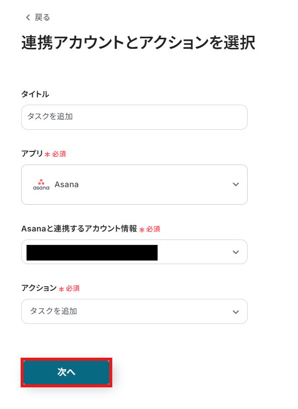 - Asanaと連携するアカウント情報:フローと紐づけるアカウントを選択してください。