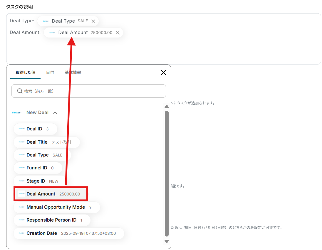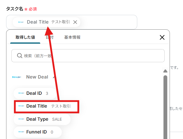 - タスク名:プルダウンより1つ前のステップで取得した「Deal Title」を選択してください。