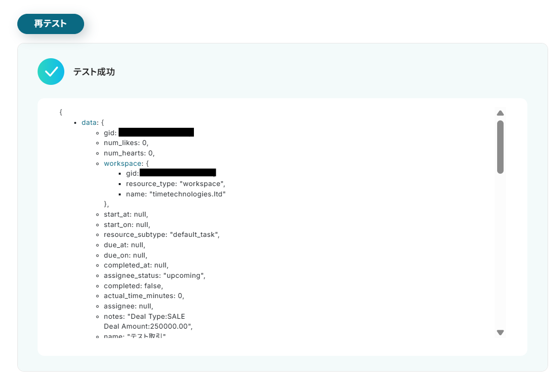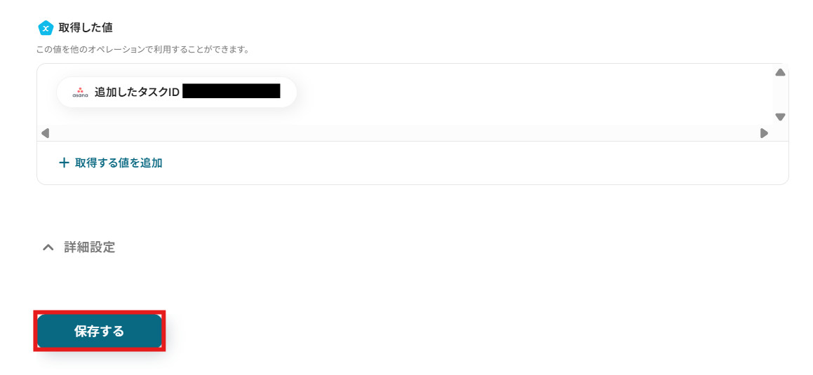 - タスクの説明:タスクの説明・詳細の文章を設定してください。こちらでも1つ前のステップで取得した値を設定することが可能です。