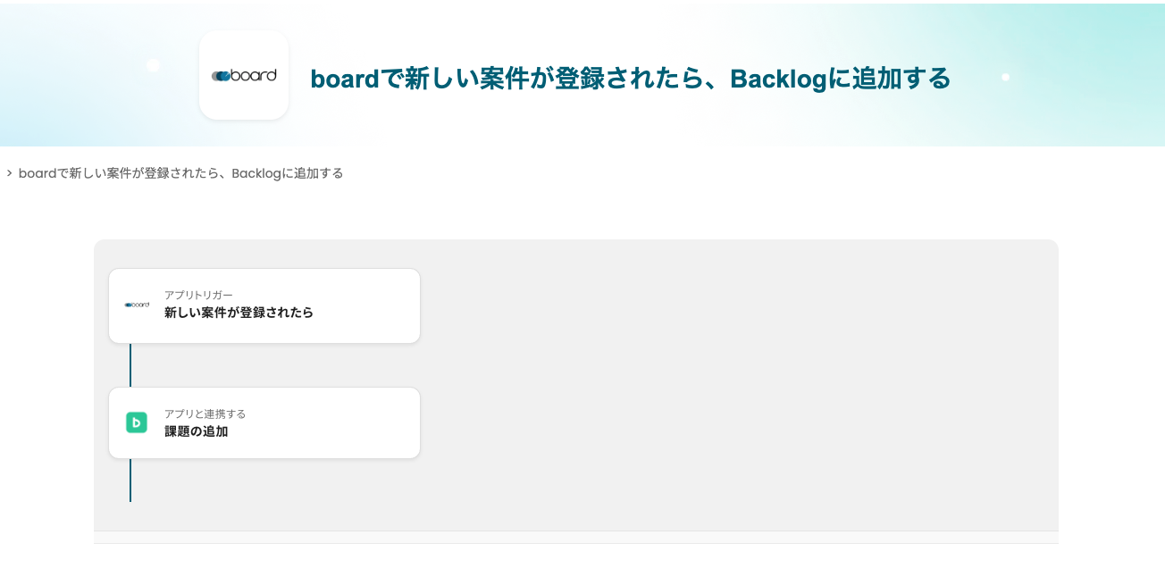 「boardで新しい案件が登録されたら、Backlogに追加する」ワークフローは、Backlogとboard の案件情報を自動でBacklog に反映し、タスク登録の手間を省く業務ワークフローです。