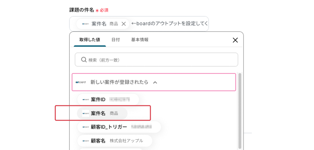 boardで、案件の種別が「新規開発」である場合や、特定の金額以上である場合など、あらかじめ設定した条件を満たす案件が登録されたときだけ、その情報をBacklogの課題として自動で追加します。