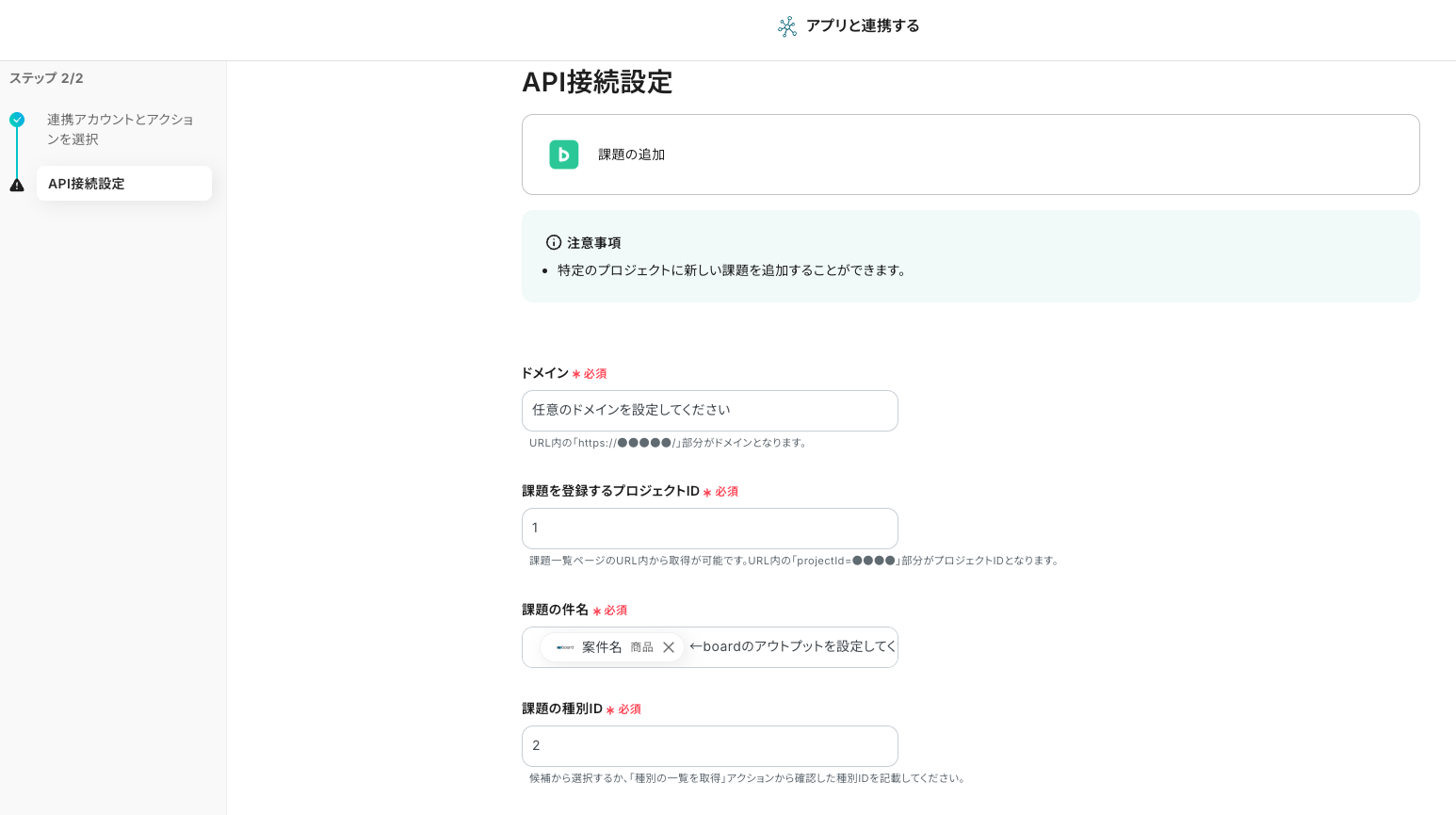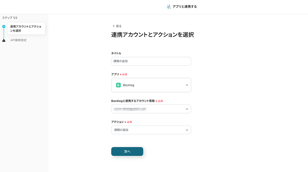 テンプレートの2つ目の工程をクリックします。この工程では前の工程で取得した値を使って、Backlogの課題を追加する設定を行います。