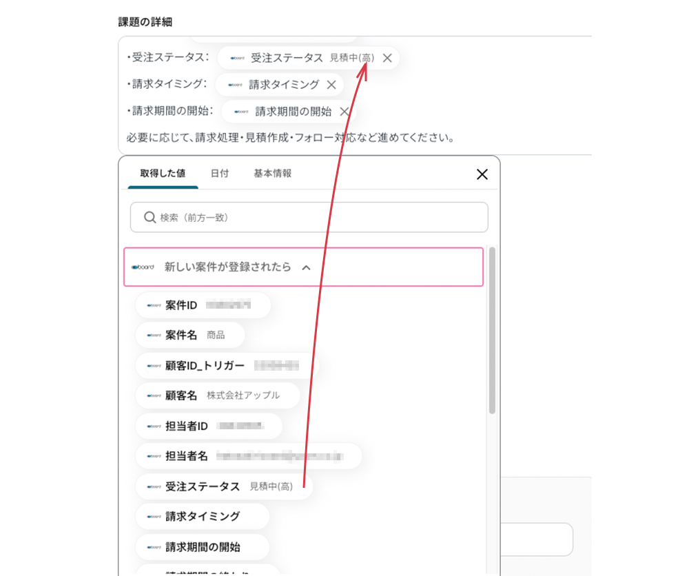 boardに登録された「案件情報」(例:案件名、顧客名、見積日など)がJSON(データのかたまり)という形でYoomに読み取られた状態です。