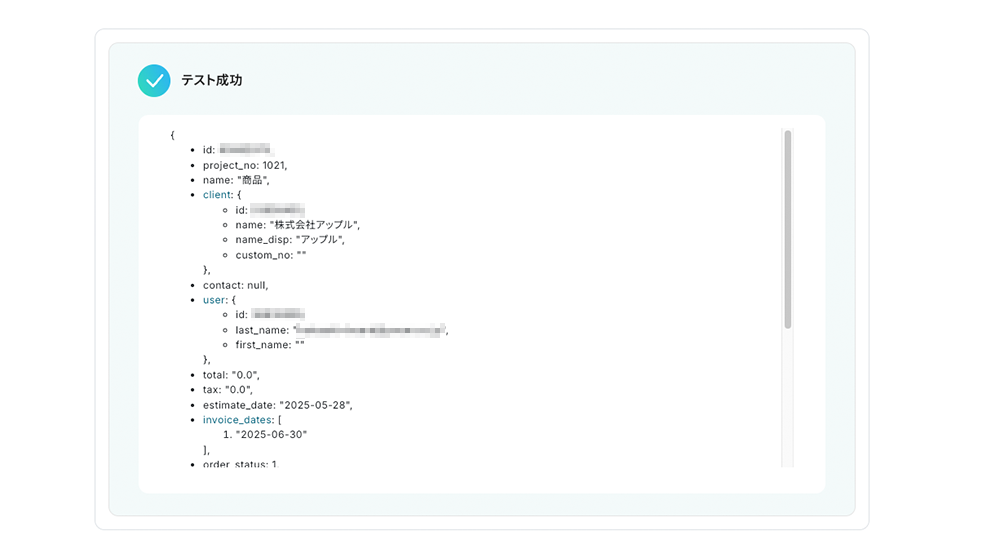 テストに成功すると上のような画面が表示されます。これは、「boardで登録された案件データが、ちゃんとYoomに届いたよ!」という確認結果です。