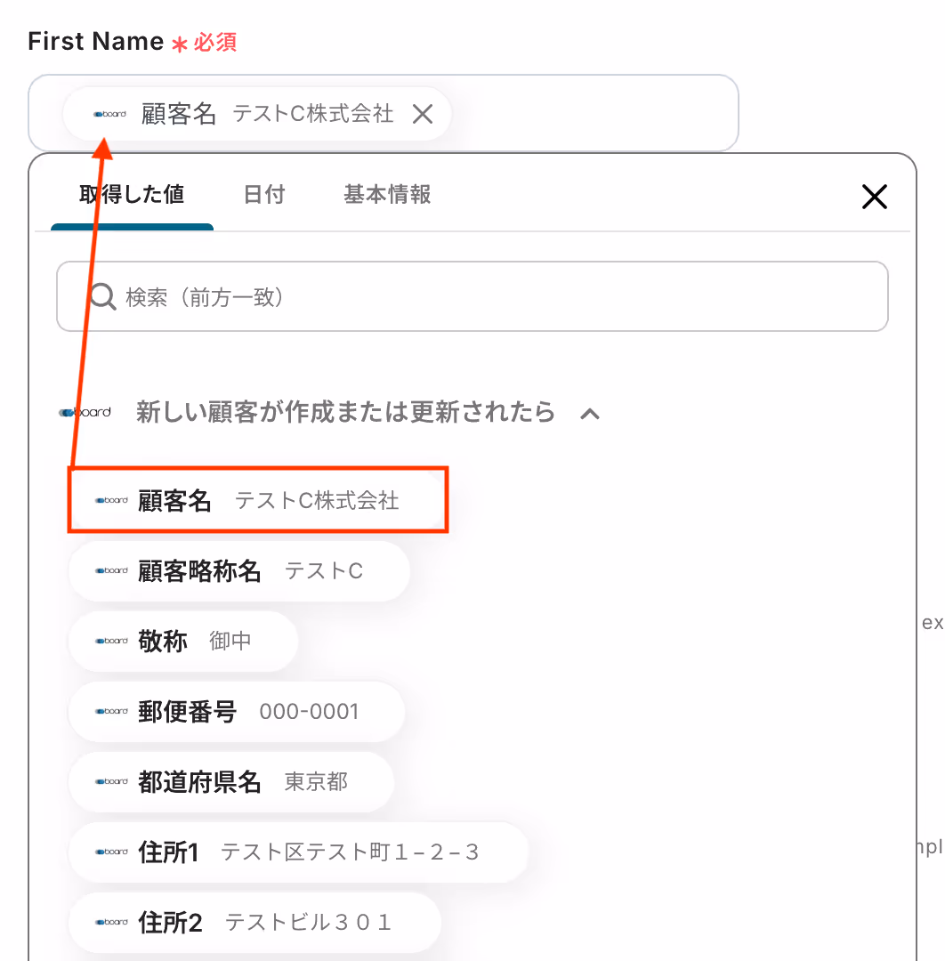 入力欄をクリックすると、前のステップでboardから取得した値が表示されるので、選択して入力してください。