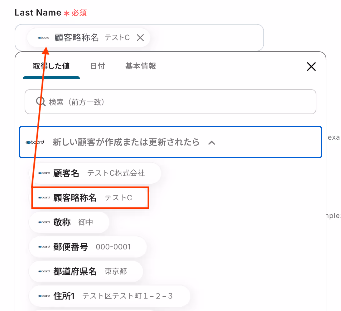 こちらもFirst Nameと同様に、入力欄をクリックすると取得した値が表示されるので選択して入力が可能です。