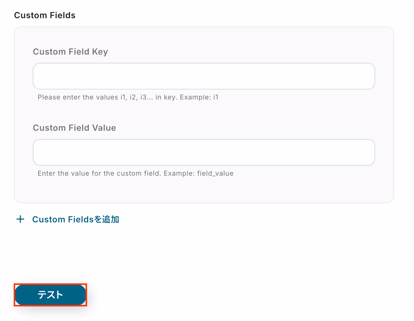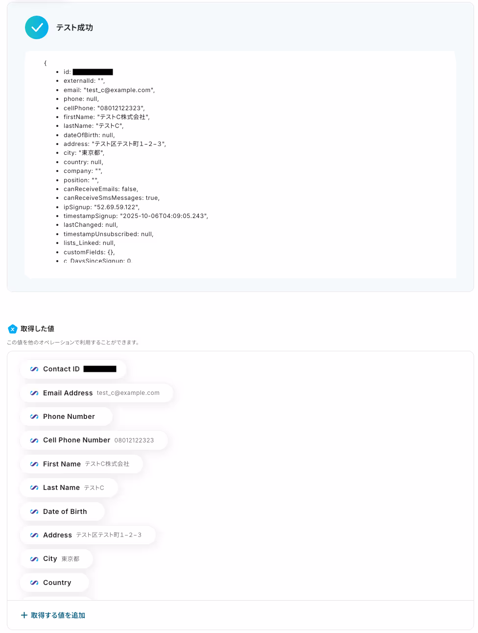 入力が完了したら「テスト」をクリックして、設定した内容でSmooveにContactが作成されるか確認しましょう。