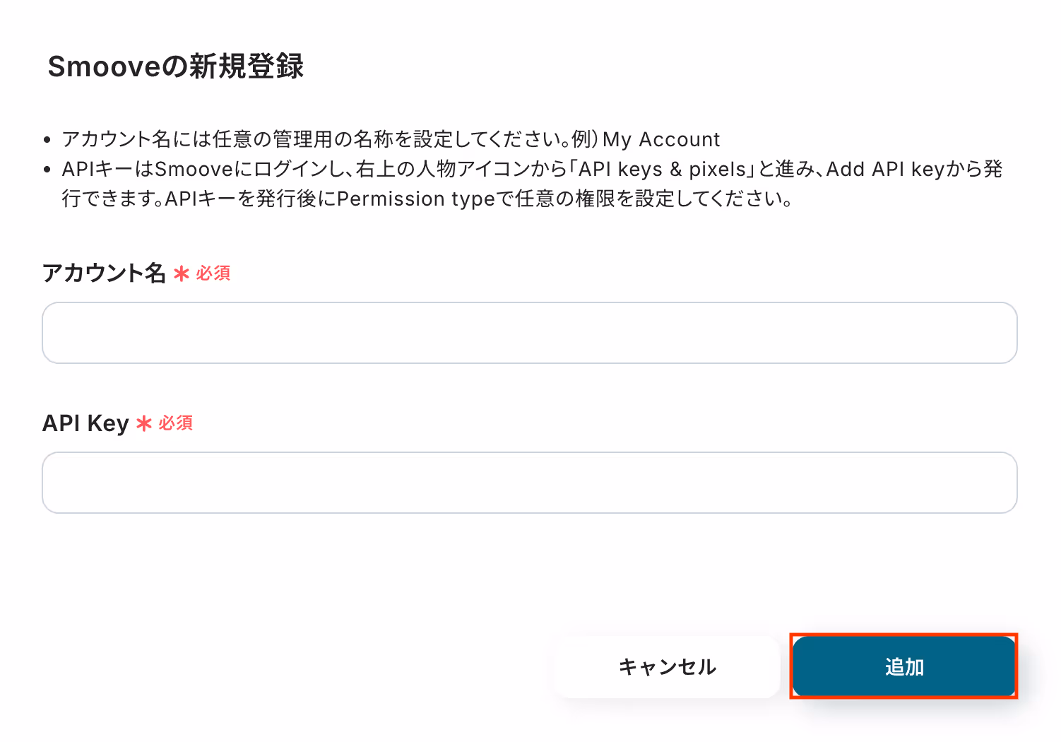 以下の画面が表示されるので、アカウント名とAPI Keyを注釈に沿って入力し、「追加」をクリックしましょう。