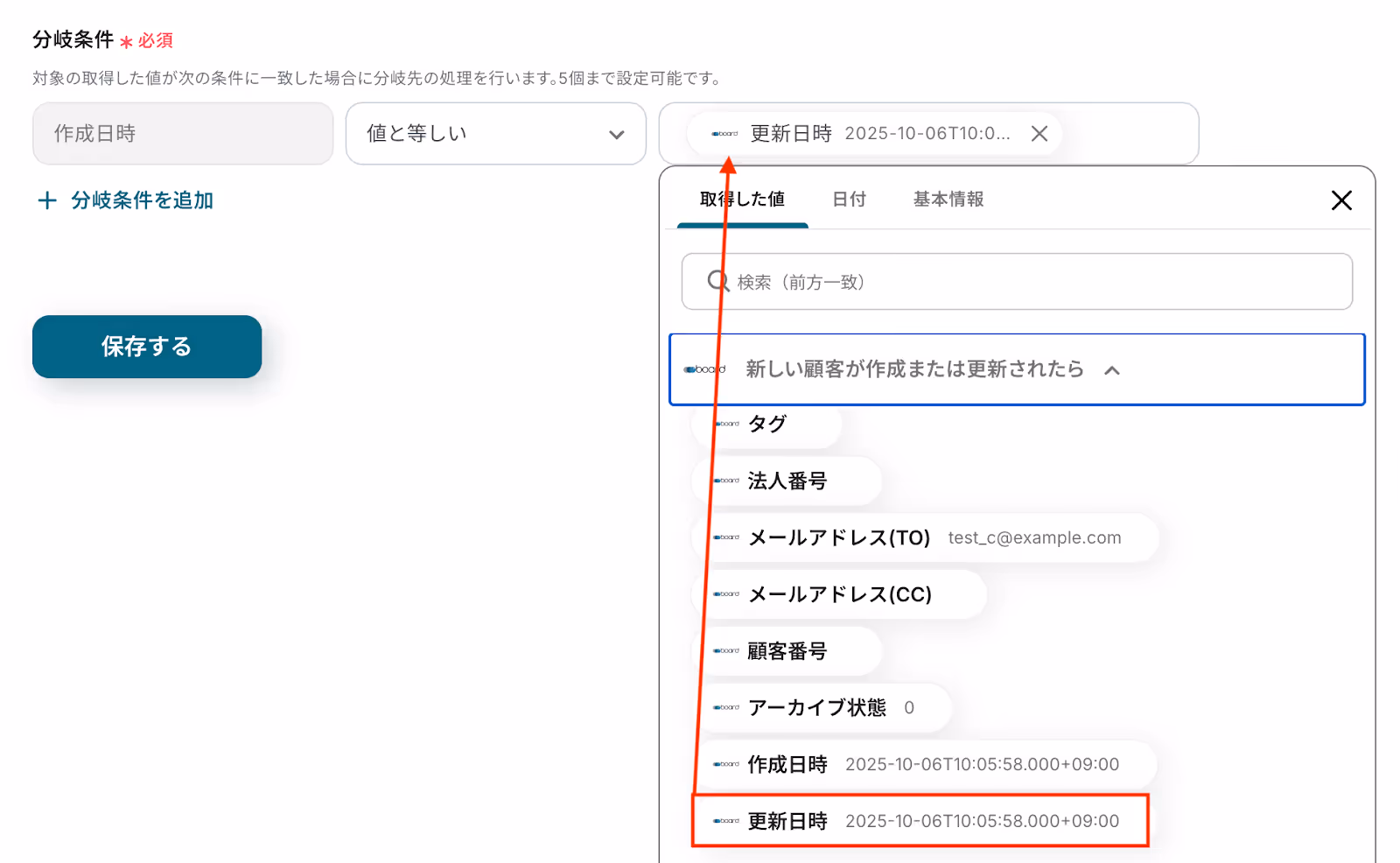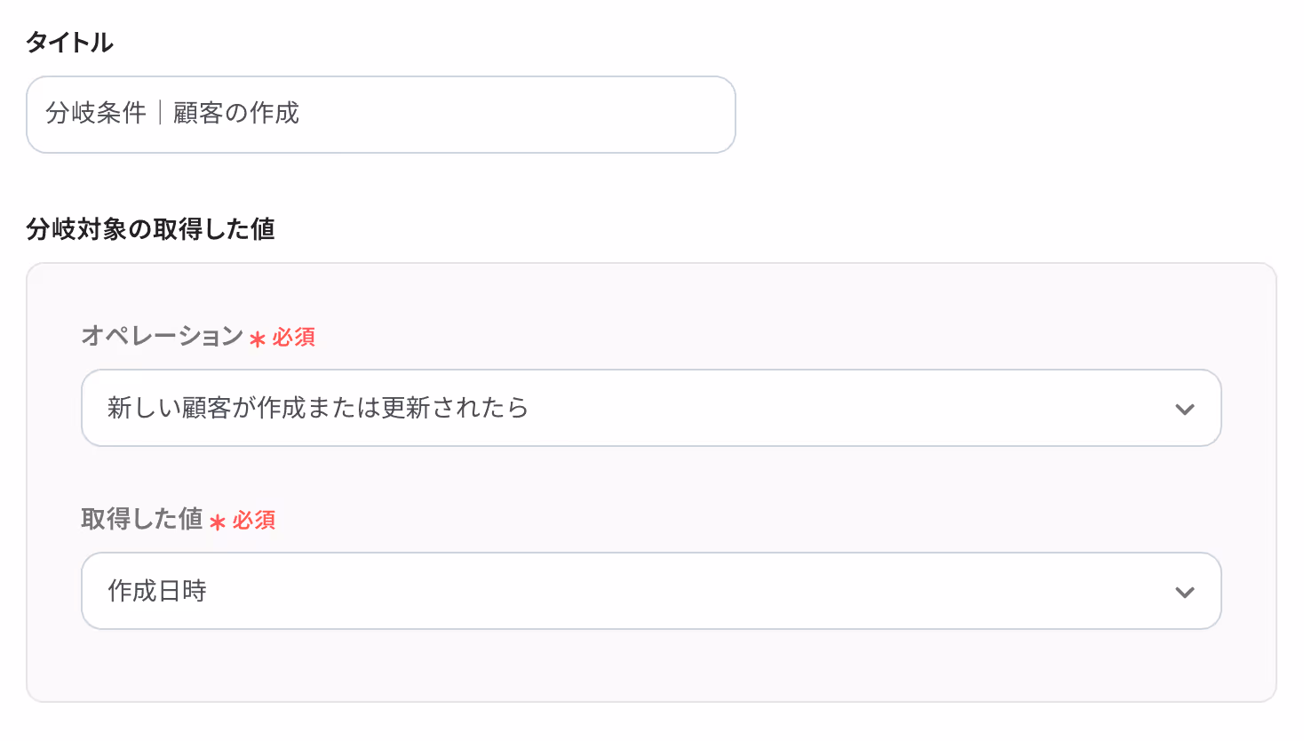 新たに顧客が作成された日時を基準に処理を分ける設定です。