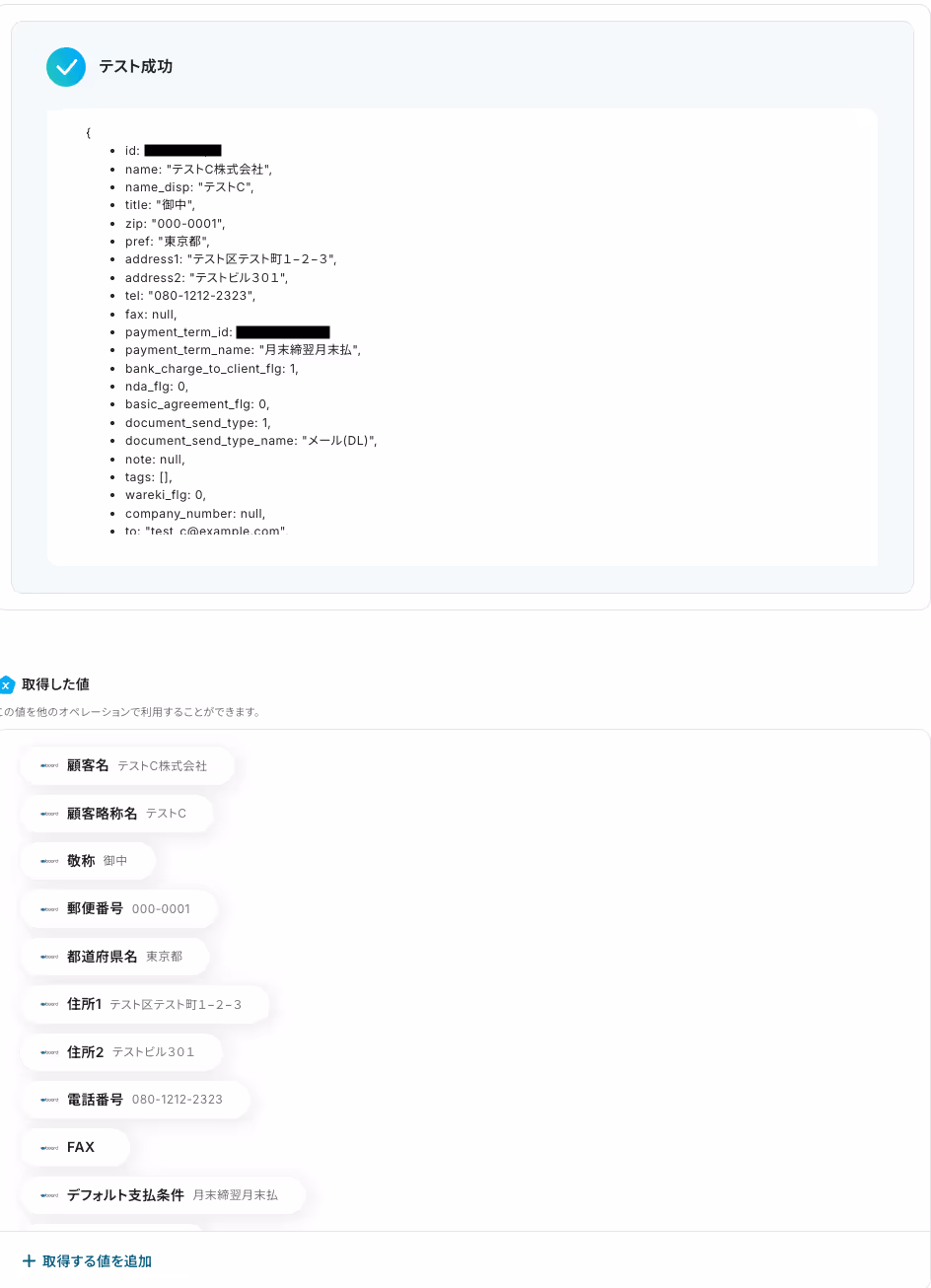 以下の画像の取得した値は、この後のステップで使用が可能です。