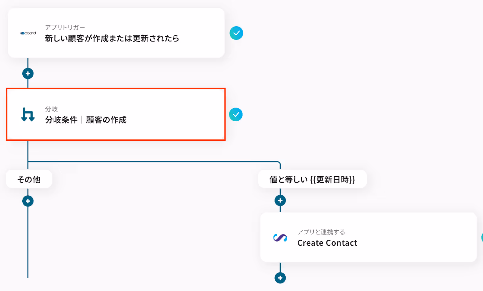 boardで新しい顧客が作成された場合にのみ処理を行うよう、分岐条件を設定します。