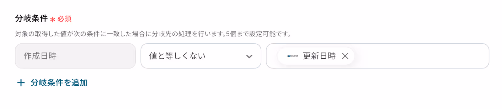 以下のように「作成日時と更新日時が等しくない場合」という条件(=更新と判定)を設定することで、boardの顧客の更新に絞ったフローが作成できます。