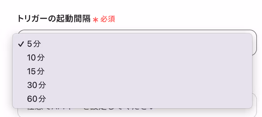 テスト用の案件作成が完了したら「トリガーの起動間隔」を5分・10分・15分・30分・60分から選択します。