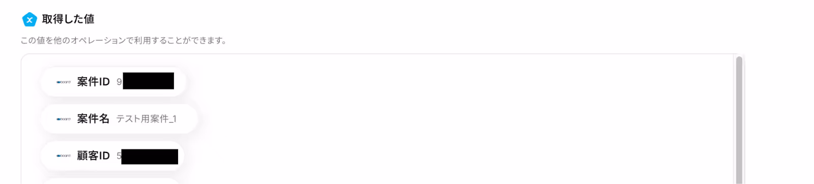 テストに成功すると「取得した値」としてboardに登録した案件データがアウトプットされます。