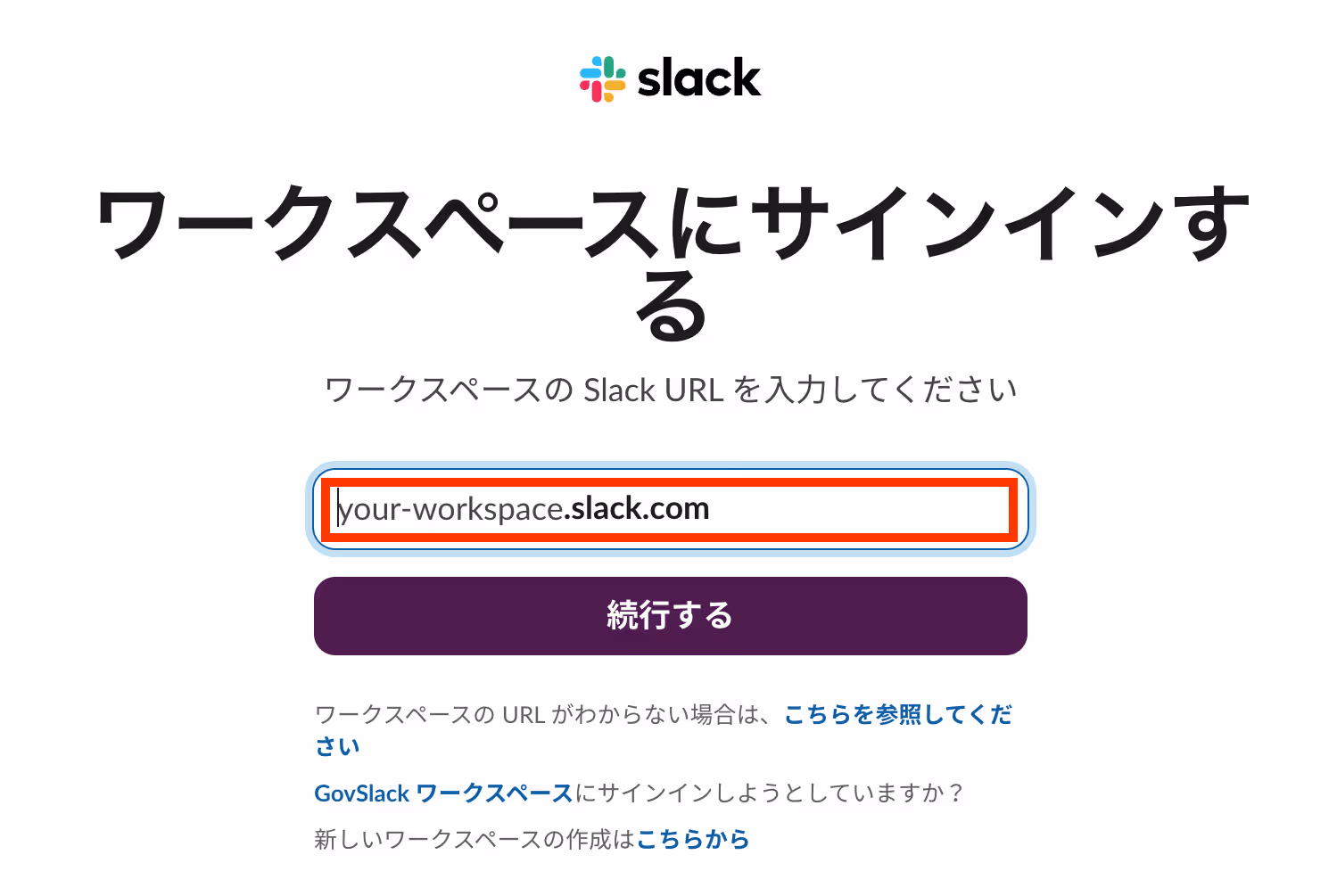 Slackを検索するとサインインページが表示されるので、ワークスペースのURLを入力します。