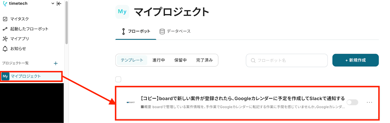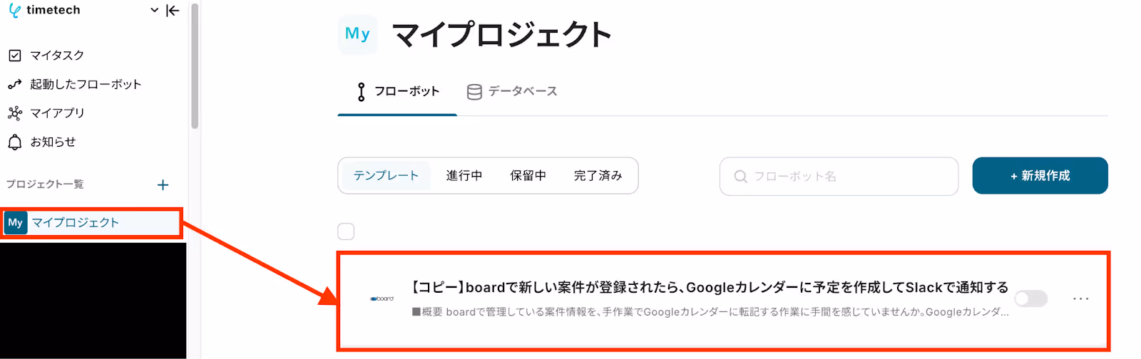 左側にあるメニューの「マイプロジェクト」から、コピーしたテンプレートを開きます。