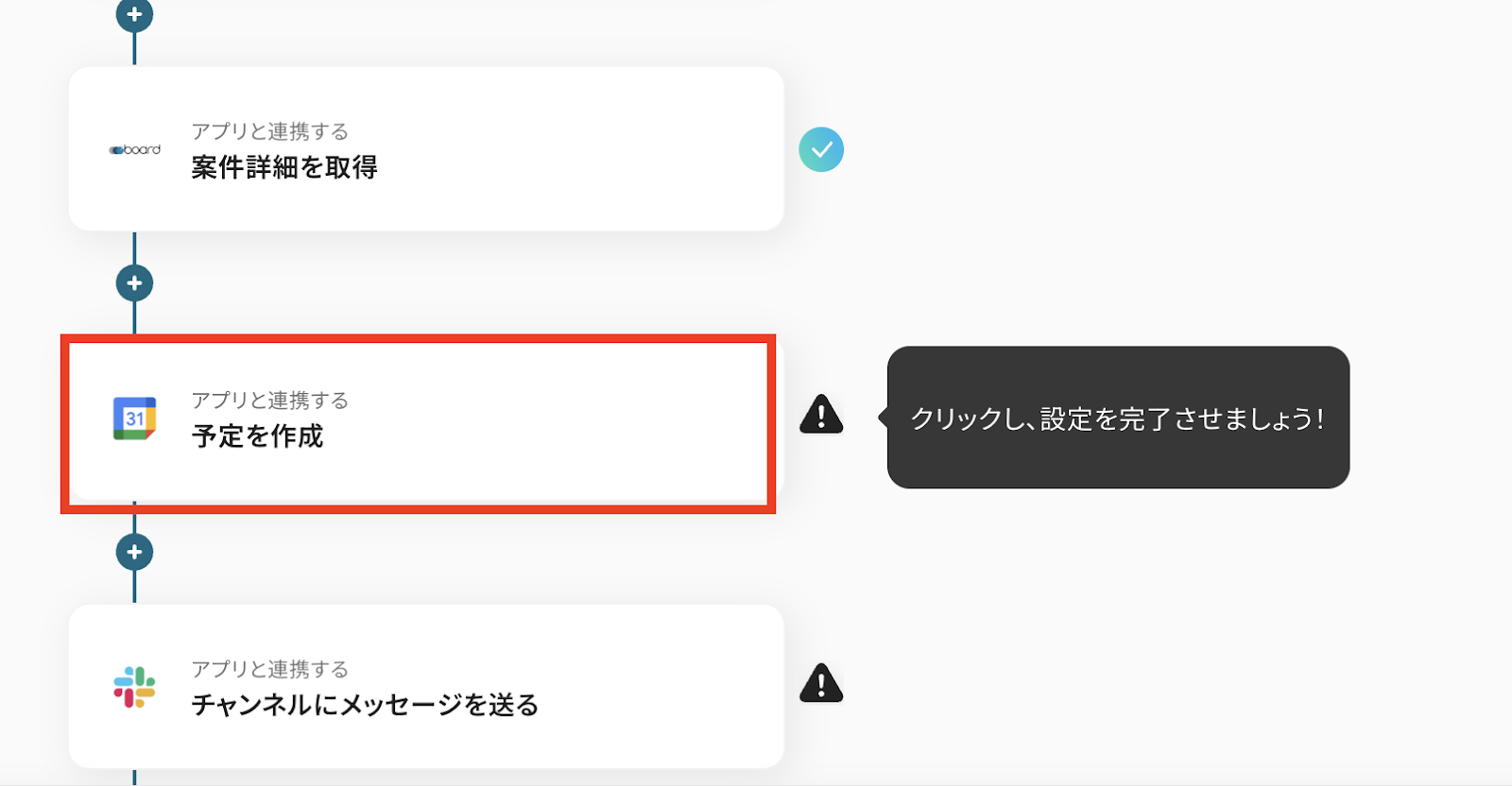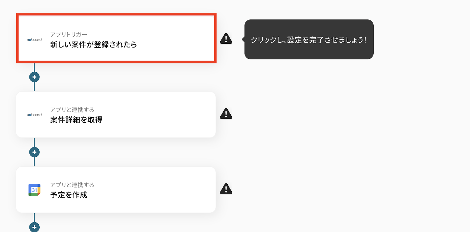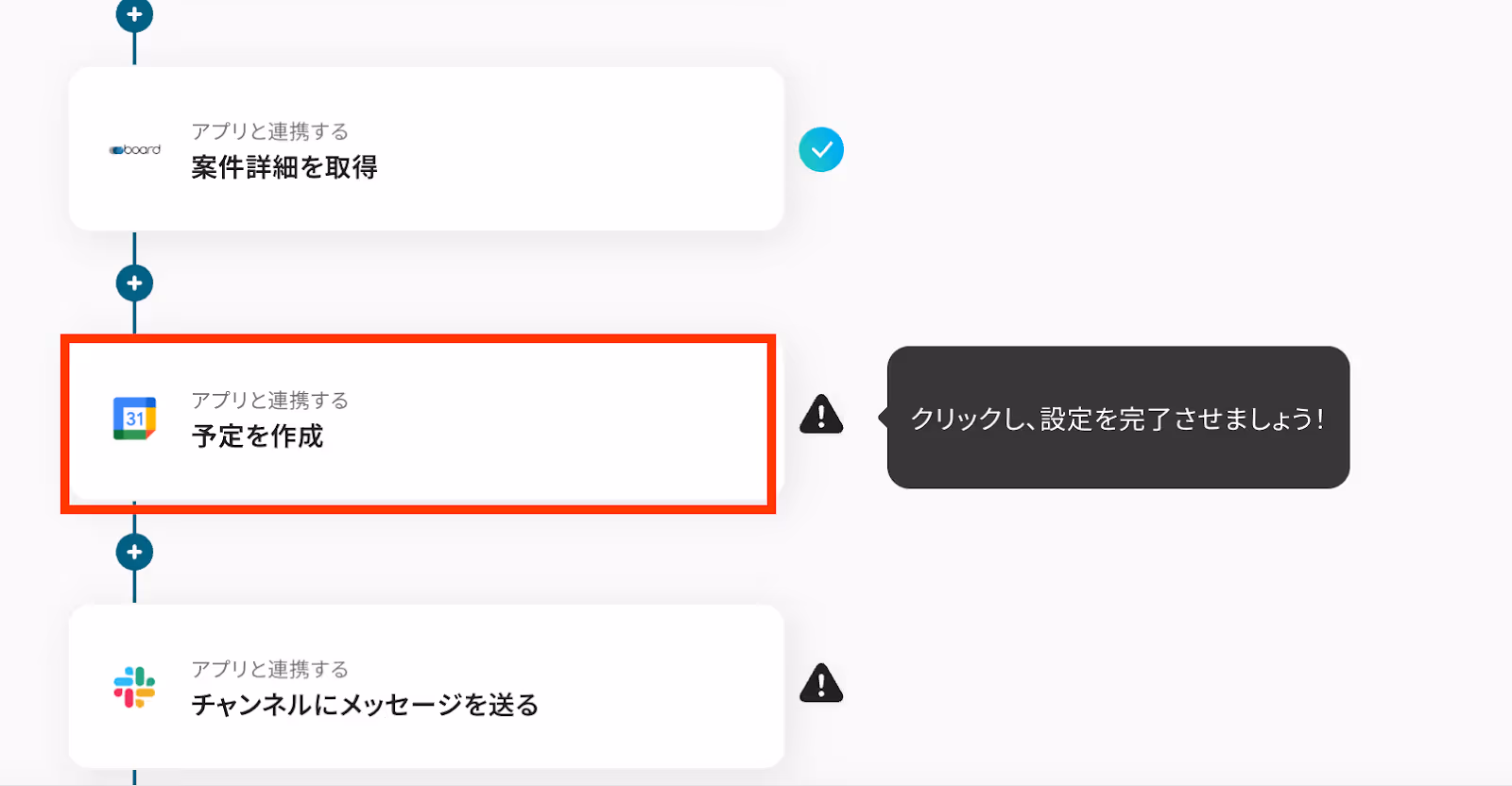 それではここから代表的な例として、boardに新しい案件が登録された際に、Googleカレンダーに予定を自動で作成し、Slackで通知するフローを解説していきます!