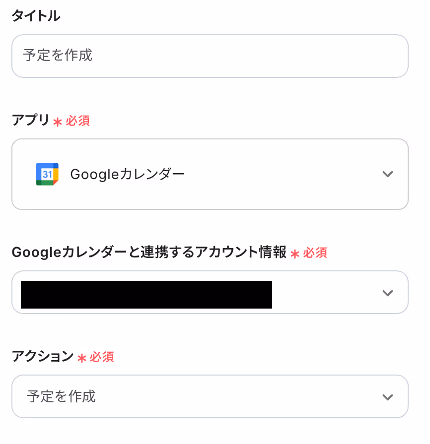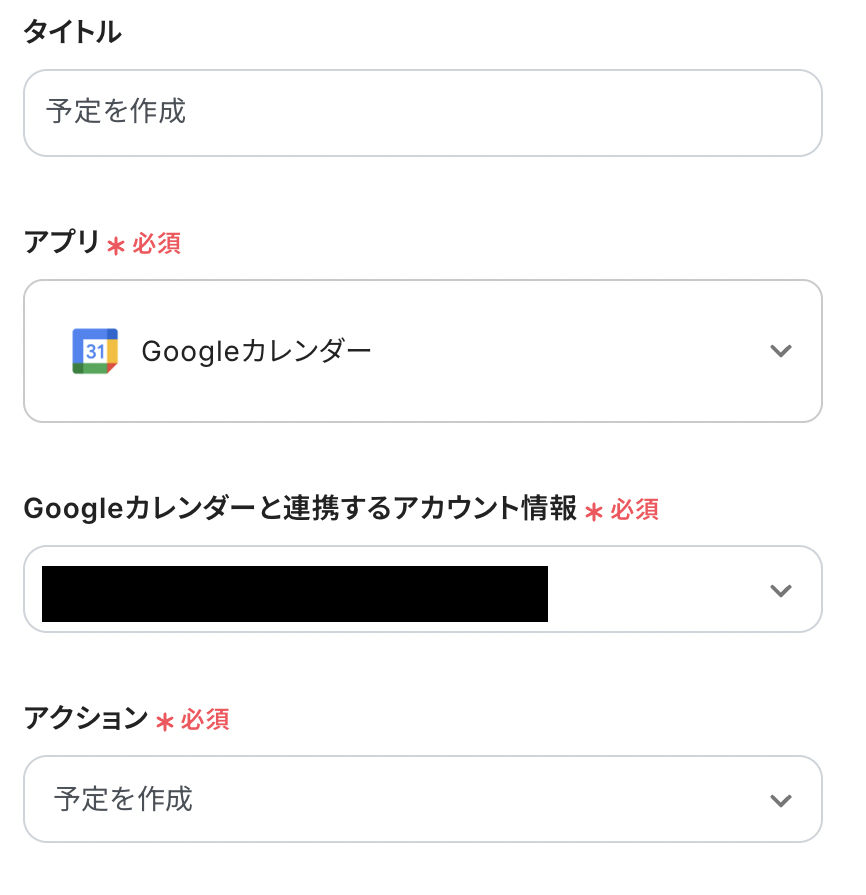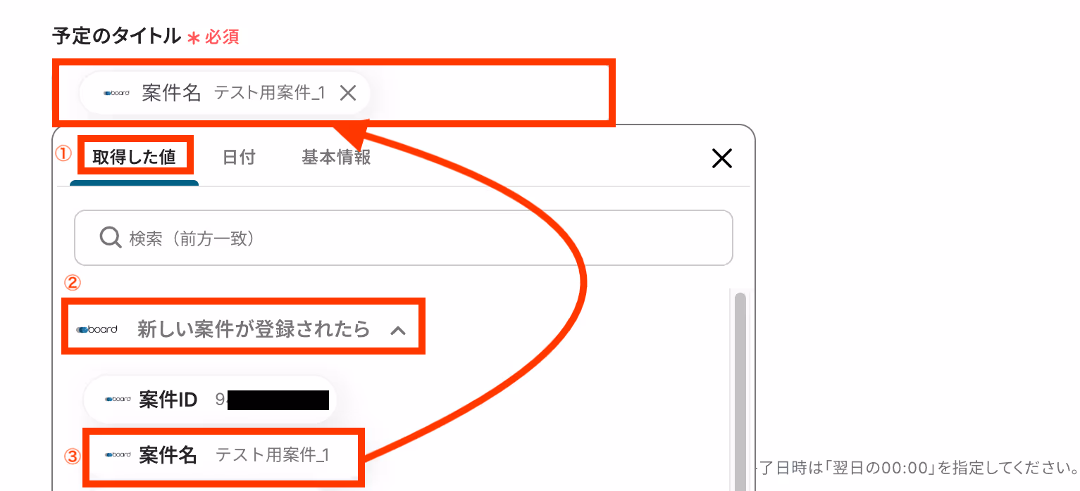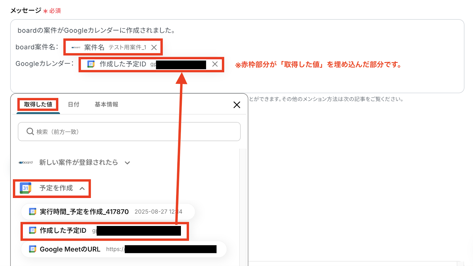 「予定のタイトル」はステップ3で取得した値を埋め込みます。