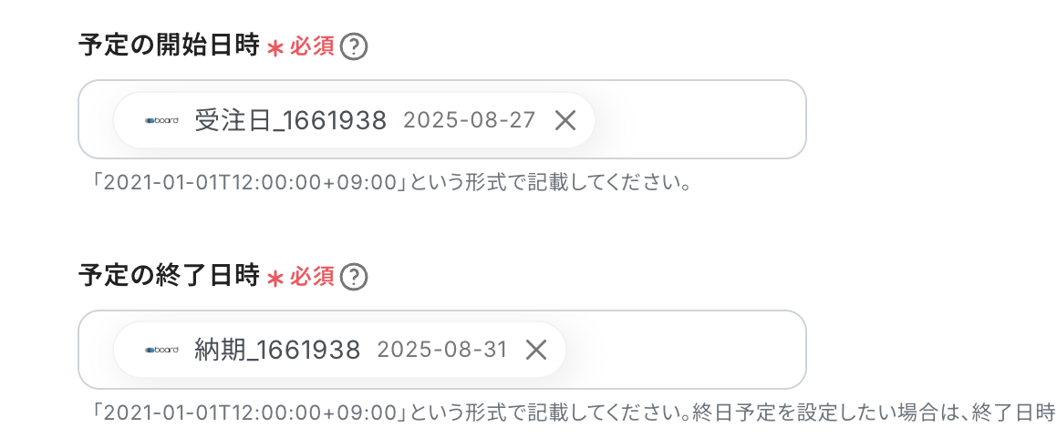 今回は、予定の開始日時を「受注日」として、終了日時を「納期日」としたので、ステップ4で取得した値を埋め込んでいます!