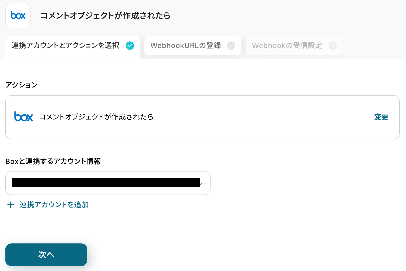 アクションはそのままで、連携するアカウント情報を確認します。 確認後、「次へ」をクリックしましょう!