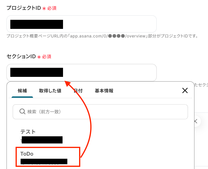 プロジェクトID・セクションID :入力欄をクリックして表示される「候補」から選択して設定します。 ※ここで指定したプロジェクトにタスクが追加されます。