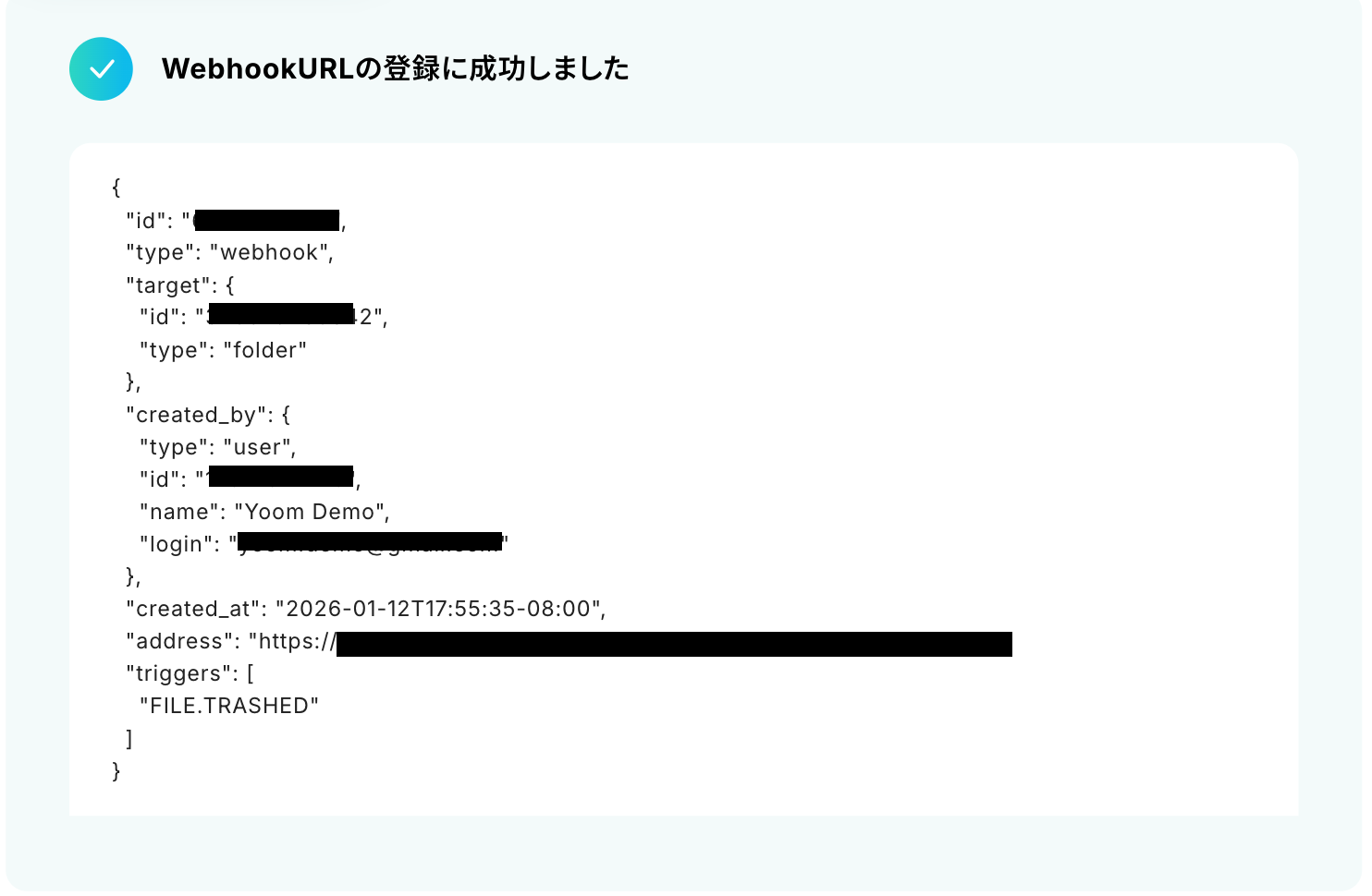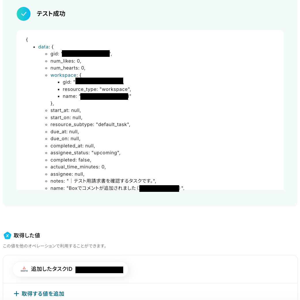 Boxのトリガー設定では、通知を監視したい特定のフォルダのコンテンツIDを任意で設定してください Asanaでタスクを追加する設定では、タスクを登録したいプロジェクトIDやセクションIDを任意で設定してください また、タスクのタイトルや詳細は、Boxのトリガーから取得した情報や生成した値などを活用して設定します ■注意事項