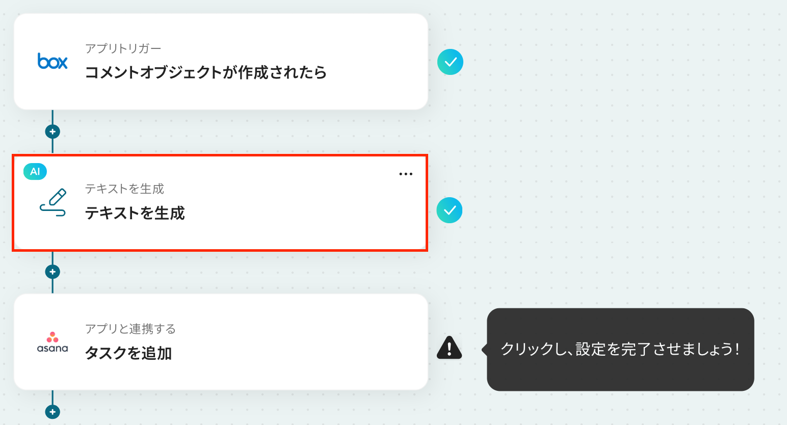 ステップ4:テキストを生成する設定 ここでは、生成AIを使用して、Asanaに追加するタスクの説明を生成する設定を行います。 以下の赤枠をクリックしてください。