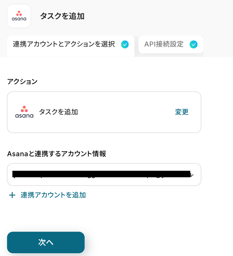 アクションはそのままで、連携するアカウント情報を確認します。 「次へ」をクリックしましょう!