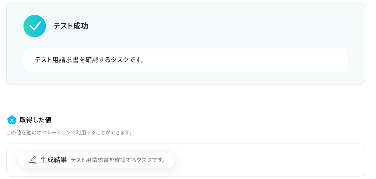 設定が完了したら、「テスト」をクリックしましょう! テストに成功すると取得した値が表示されます。 確認後、「完了」をクリックします。