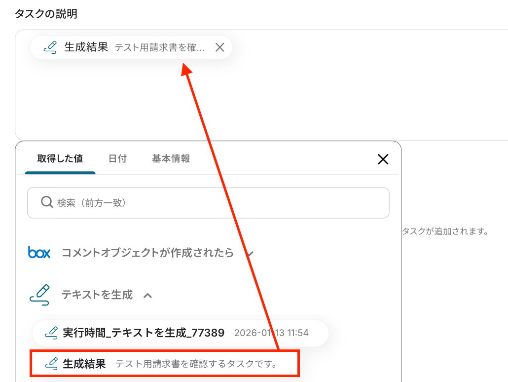 タスクの説明 :「テキスト生成」の設定で取得した値を引用して設定します。