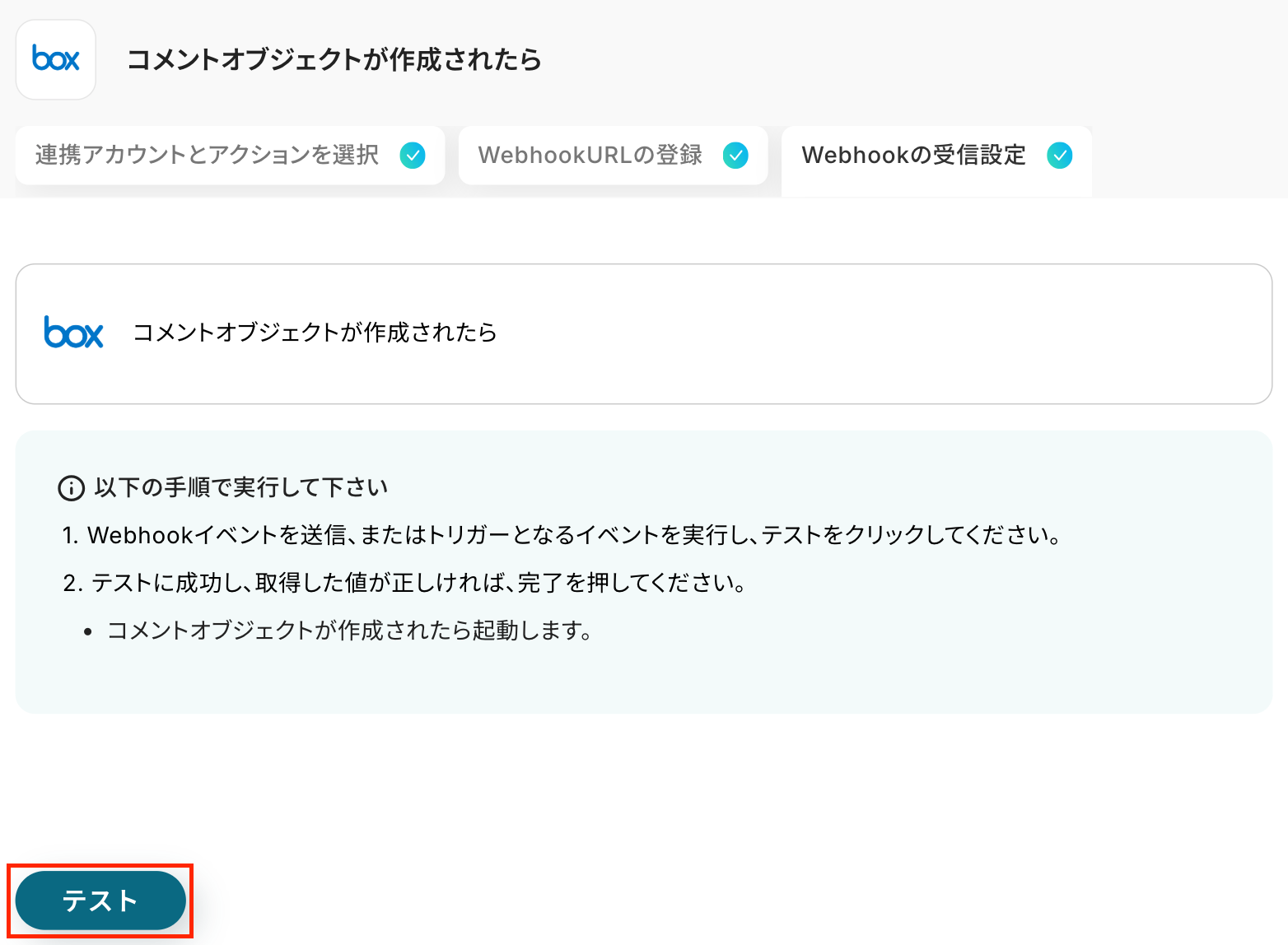 コメントを追加したら、Yoomの画面で「テスト」をクリックしましょう!