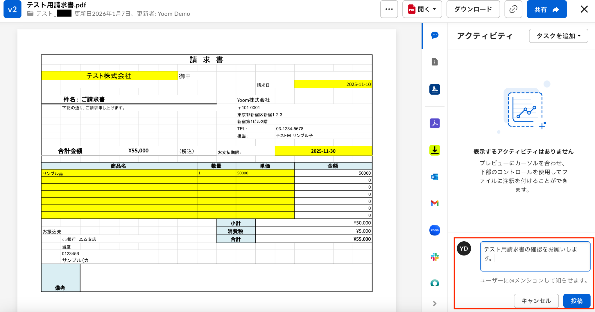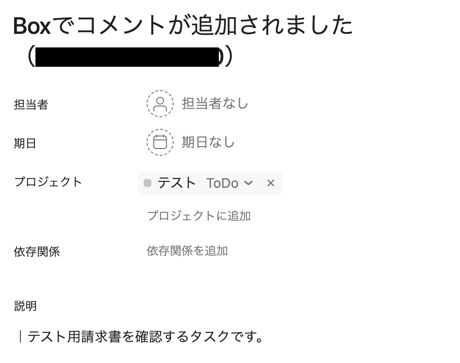 ここで、Boxの画面に移り、コメントを追加します。 後続のオペレーションでAsanaにタスクを追加する想定でコメントをしてください。 今回は赤枠のコメントを追加しました。
