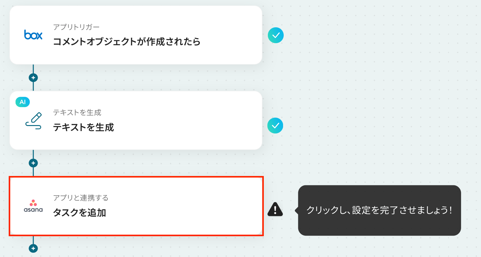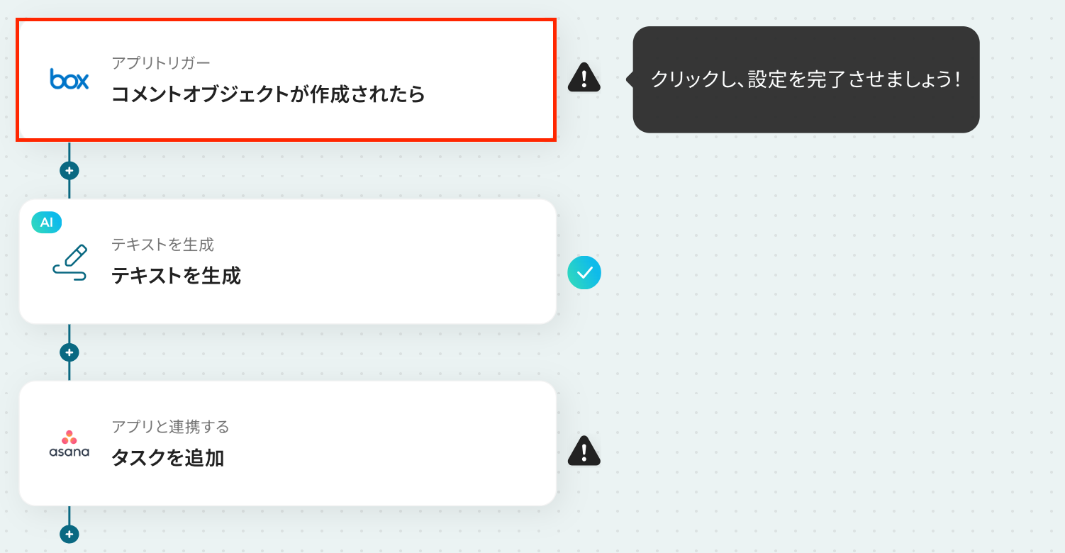 ステップ3:Boxのトリガー設定 最初の設定です! ここから「Boxの指定フォルダでコメントが追加されたらAsanaにタスクを追加する」 フローを設定していきます! 赤枠部分をクリックしましょう。
