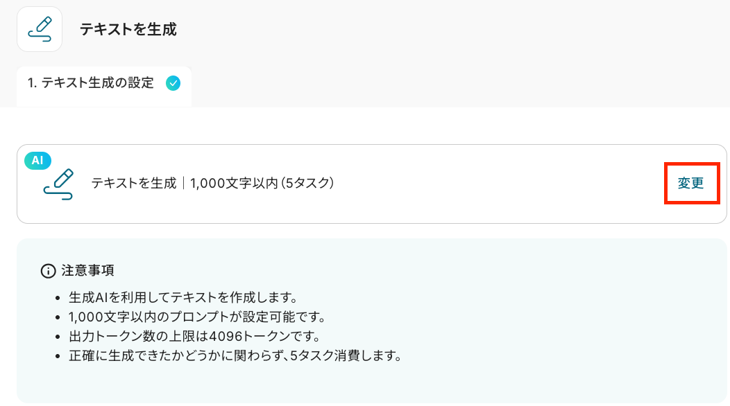 以下の画面が表示されるので、注意事項を確認しましょう。 赤枠部分の「変更」をクリックすると、「指示可能なプロンプトの文字数」 を変更できます。