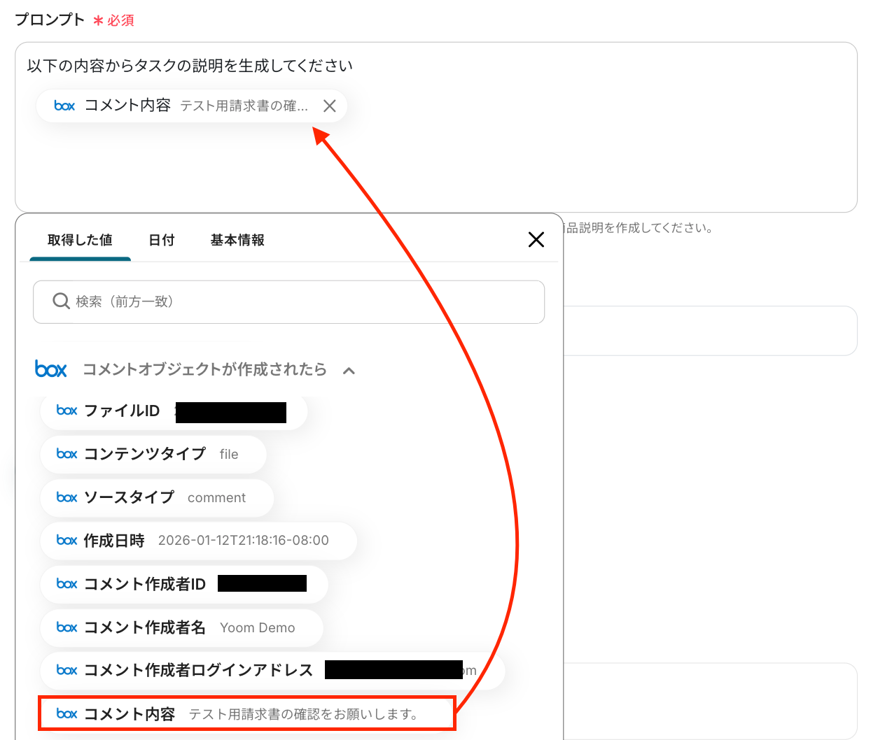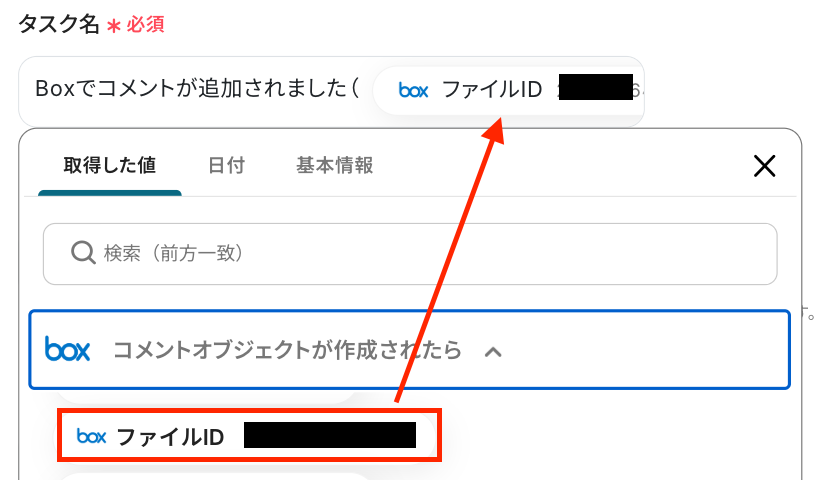 タスク名 :任意の内容や取得した値を使用して設定してください。 以下は、Boxのトリガー設定で取得した値を引用して設定した例です。