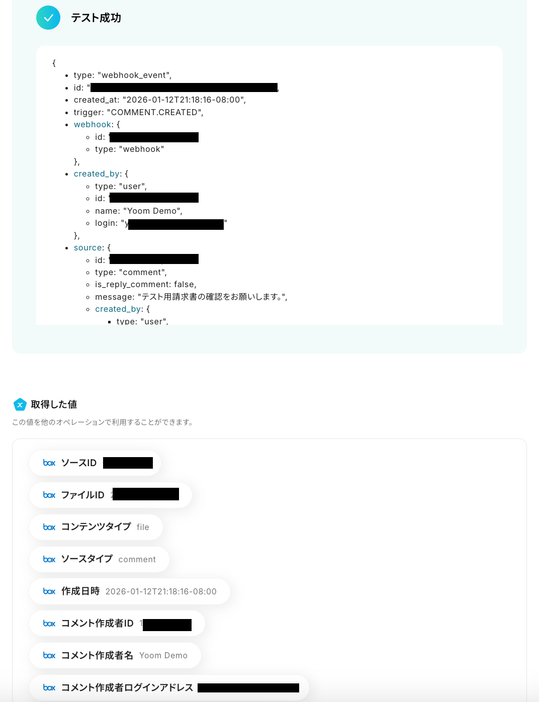 ※ 取得した値 とは? トリガーやオペレーション設定時に、「テスト」を実行して取得した値のことを指します。 後続のオペレーション設定時の値として利用でき、フローボットを起動する度に変動した値となります。