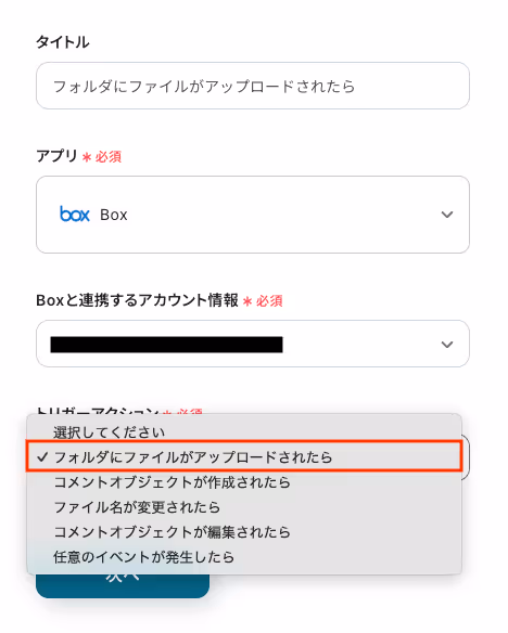 続いて、連携アカウントとアクションを選択に進みます。各項目を確認し、「次へ」をクリックしましょう。