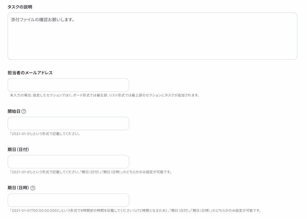 「プロジェクトID」「セクションID」は、それぞれ候補から選択してください。