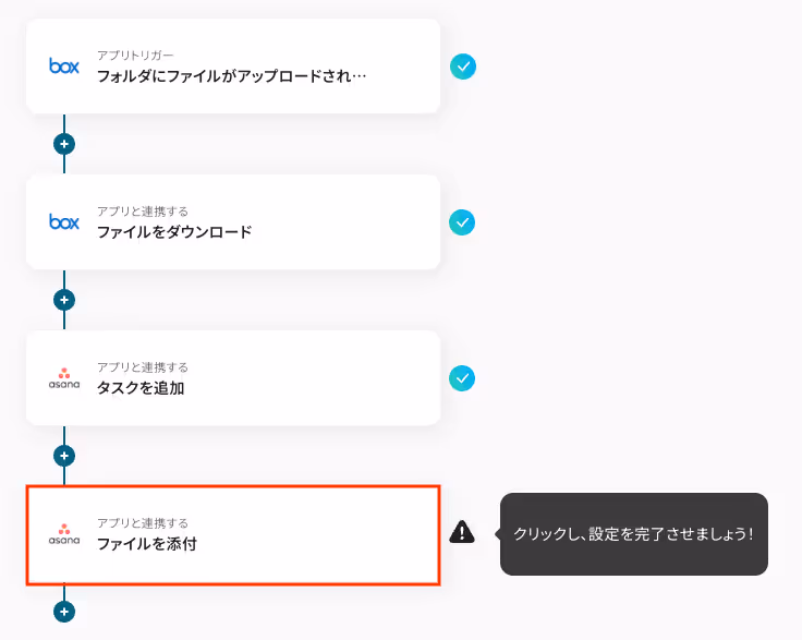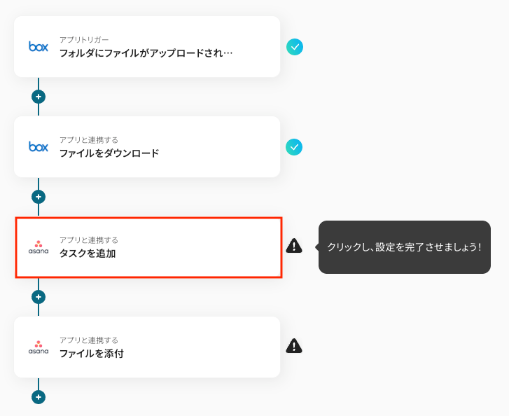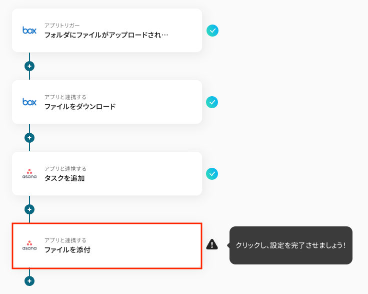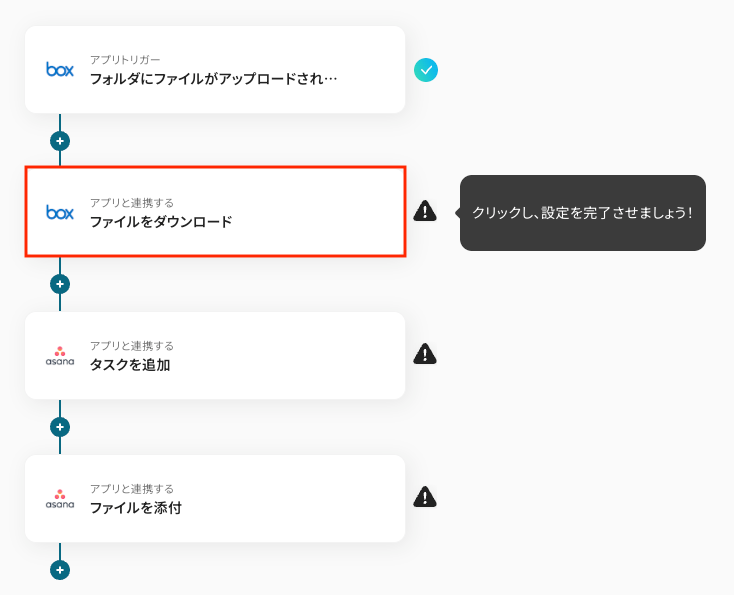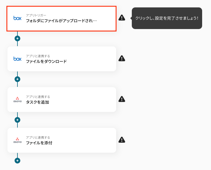 今回は「Boxにファイルがアップロードされたら、Asanaにファイル付きのタスクを作成する」フローを作成していきます!作成の流れは大きく分けて以下のとおりです。